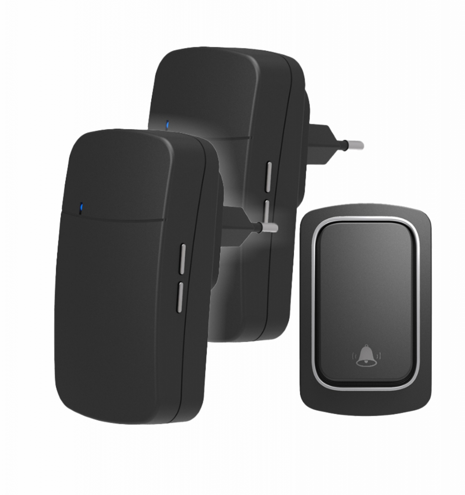 Sonerie fără fir și fără baterie 1 transmițător- comutator cinetic (1 buton) și 2 receptoare negre ( 2 sonerii) la priză , 38 melodii, distantă 150m. IP68 (buton)