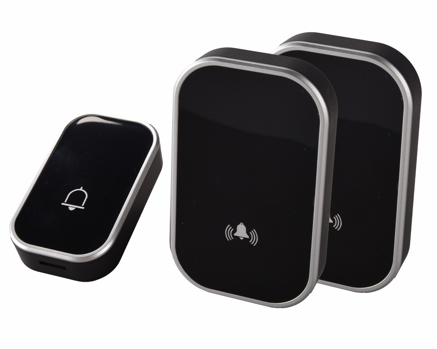 Sonerie fără fir 1 transmițător - comutator cu baterie 12V (1 buton) și 2 receptoare negre ( 2 sonerii) la priză , IP44