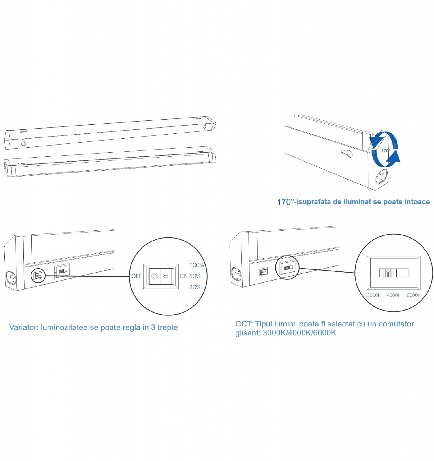 Lampă cu LED pentru mobilier, se inclina 170° 16W 120cm 1600lm temperatură de culoare reglabilă 3000K 4000K, 5000K, luminozitate reglabilă 100% 50% 20%, 2 ani garanție