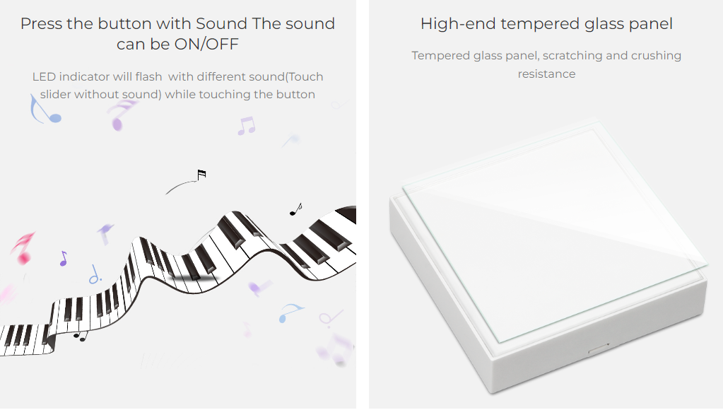 - Când butonul este atins, indicatorul LED clipește cu sunete diferite (glisorul atingeți fără sunet).