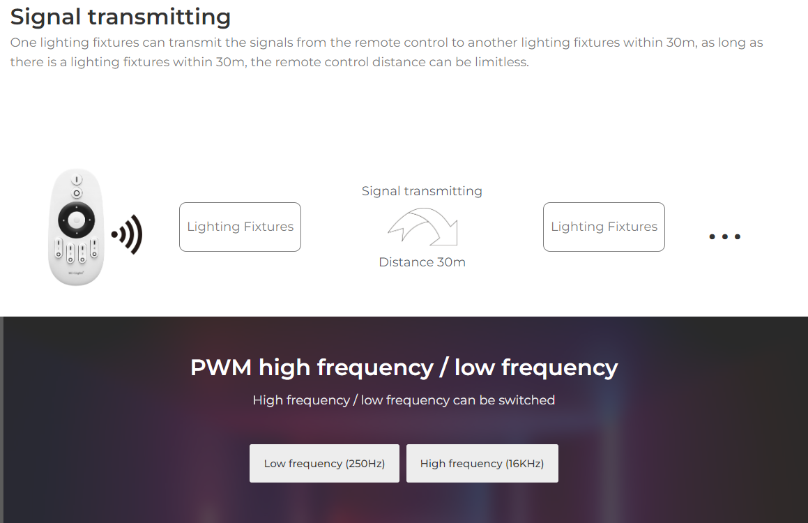 - Un corp de iluminat poate transmite semnale de telecomandă către un alt corp de iluminat pe o rază de 30 de metri, atâta timp cât există un corp de iluminat la 30 de metri, distanța telecomenzii poate fi nelimitată.