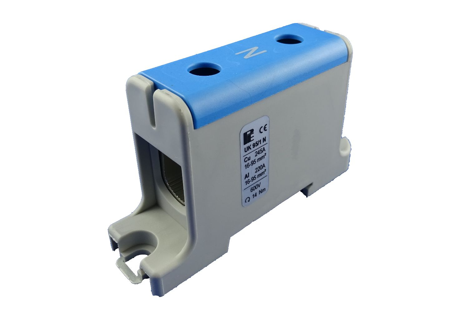 Clema terminala conexiune 1 pol albastra Cu-Al 2x95mm² montare pe sina DIN 35mm 220A (Al) 245A ( Cu)