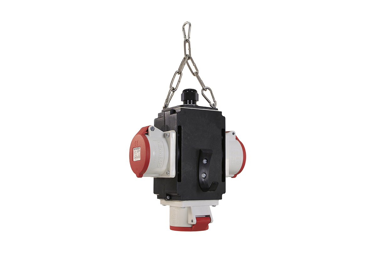 Distribuitor de energie suspendat cu 3 prize trifazice 400V 5 poli 16A IP44 cu conexiune la aer comprimat