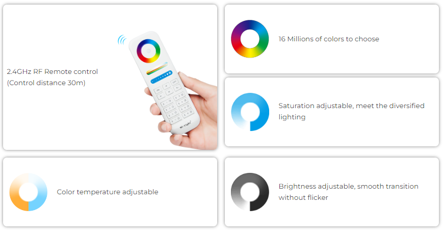 Compatibil cu modurile de ieșire monocrom, CCT, RGB, RGBW și RGB+CCT. Transmisia semnalului și sincronizarea modului