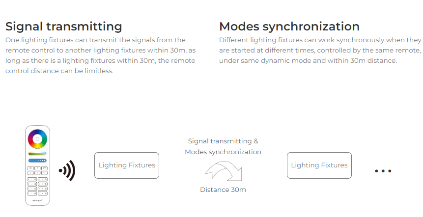 Un corp de iluminat poate transmite semnale de telecomandă către un alt corp de iluminat pe o rază de 30 de metri, atâta timp cât există un corp de iluminat la 30 de metri, distanța telecomenzii poate fi nelimitată.