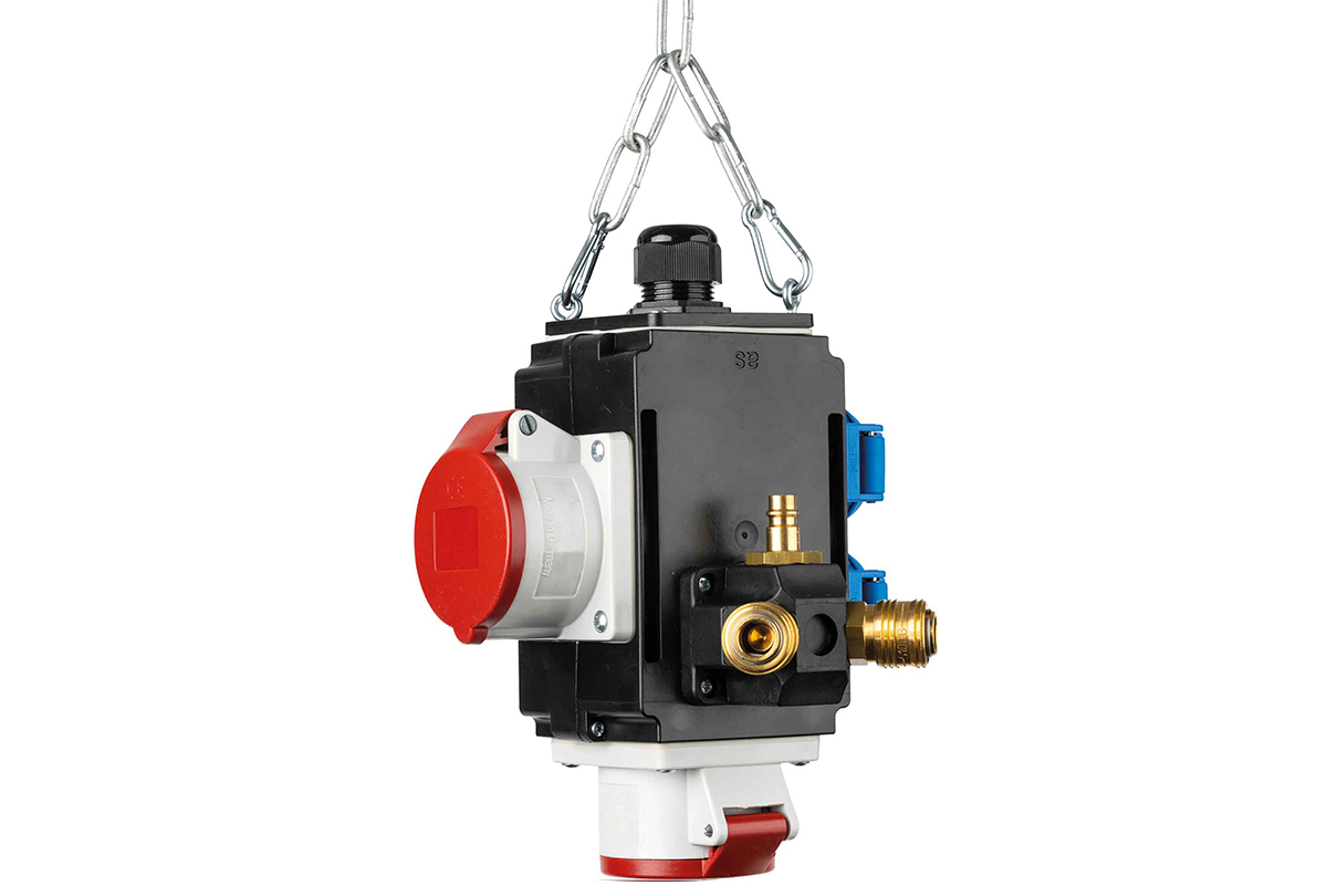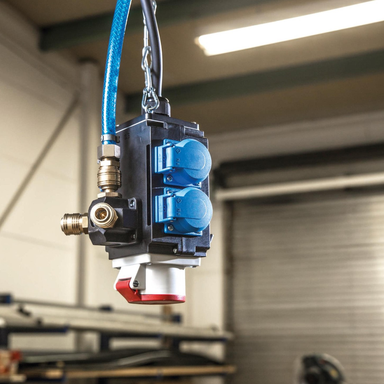 Distribuitor de energie suspendat 2 prize trifazice 400V 5 poli 16A IP44 si cu 2 prize monofazice schuko 16A IP44 cu conexiune la aer comprimat