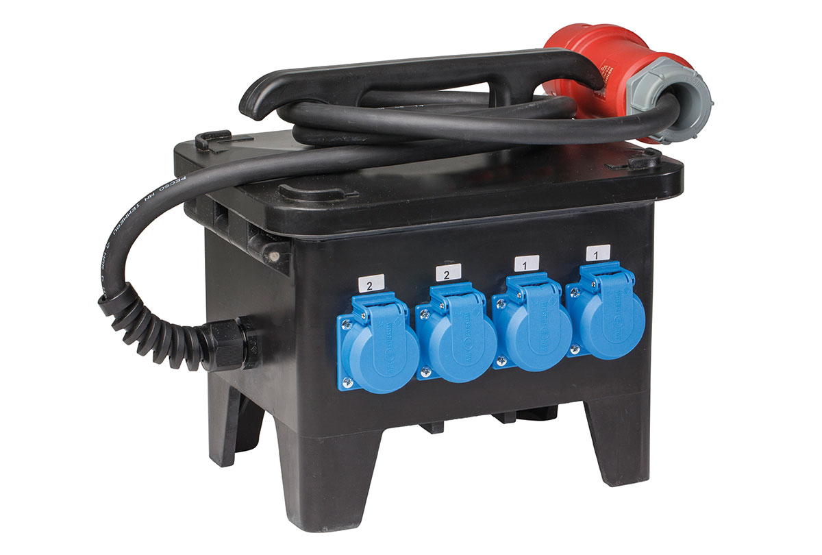 Distribuitor de putere pentru santier 32A 22kW IP44 intrare cablu H07RN-F 5G6 2m fisa 5 poli 6h 32A iesire 1x priza CEE 5 poli 16A 1 x priza CEE 5 poli 32A si 4 prize schuko IP44