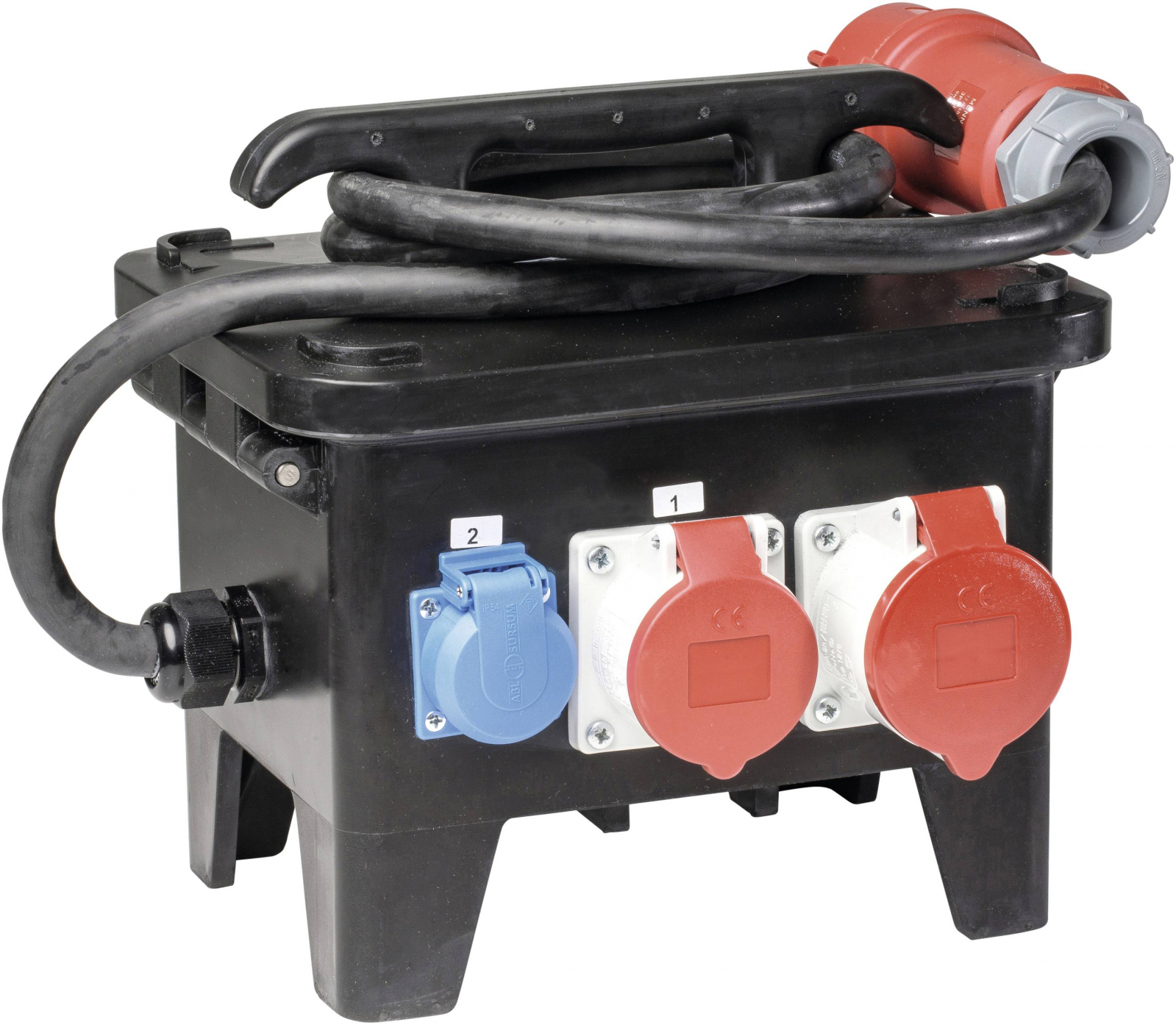 Distribuitor de putere pentru santier 32A 22kW IP44 intrare cablu H07RN-F 5G6 2m fisa 5 poli 6h 32A iesire 2 x prize CEE 5 poli 16A , 1 x priza CEE 5 poli 32A si 4 prize schuko IP44