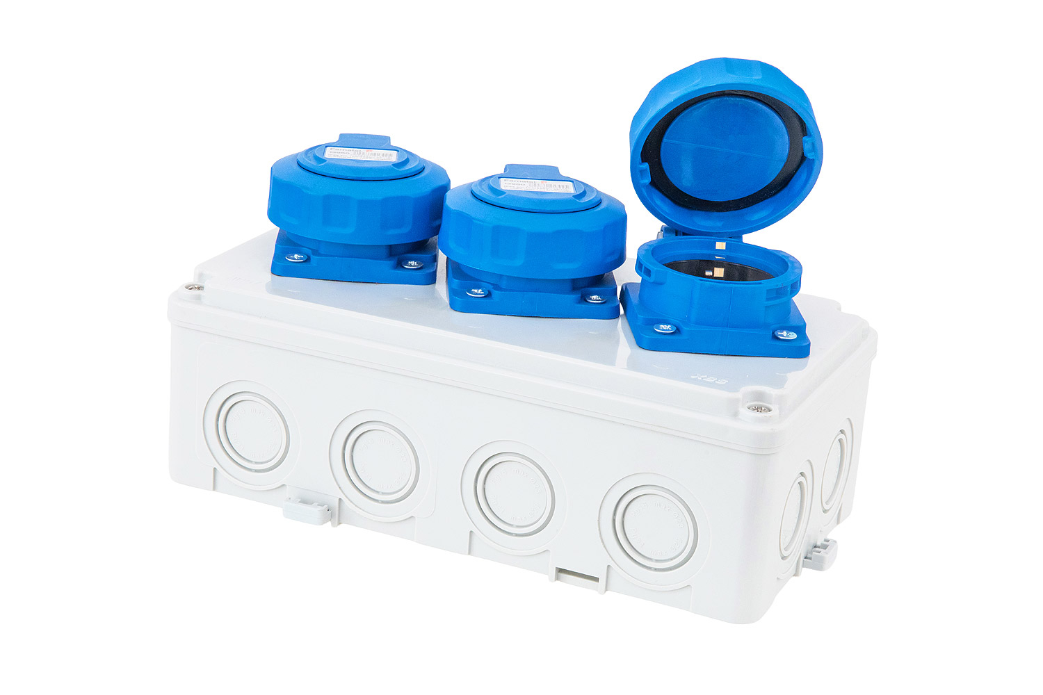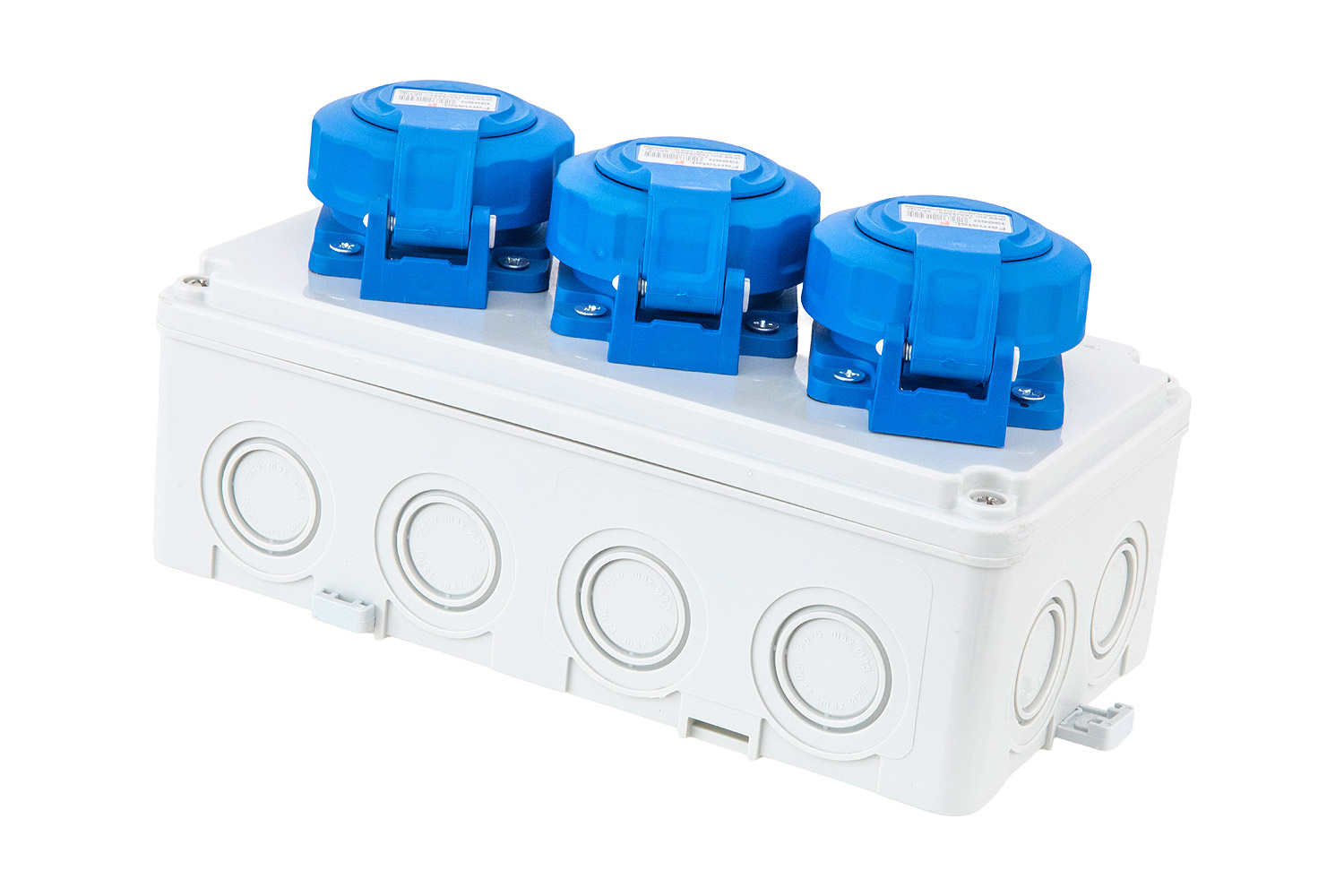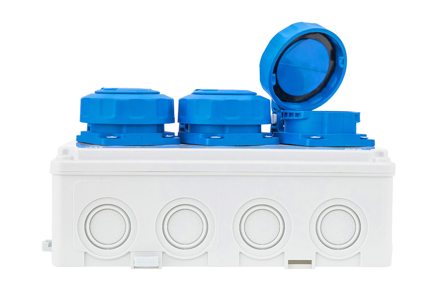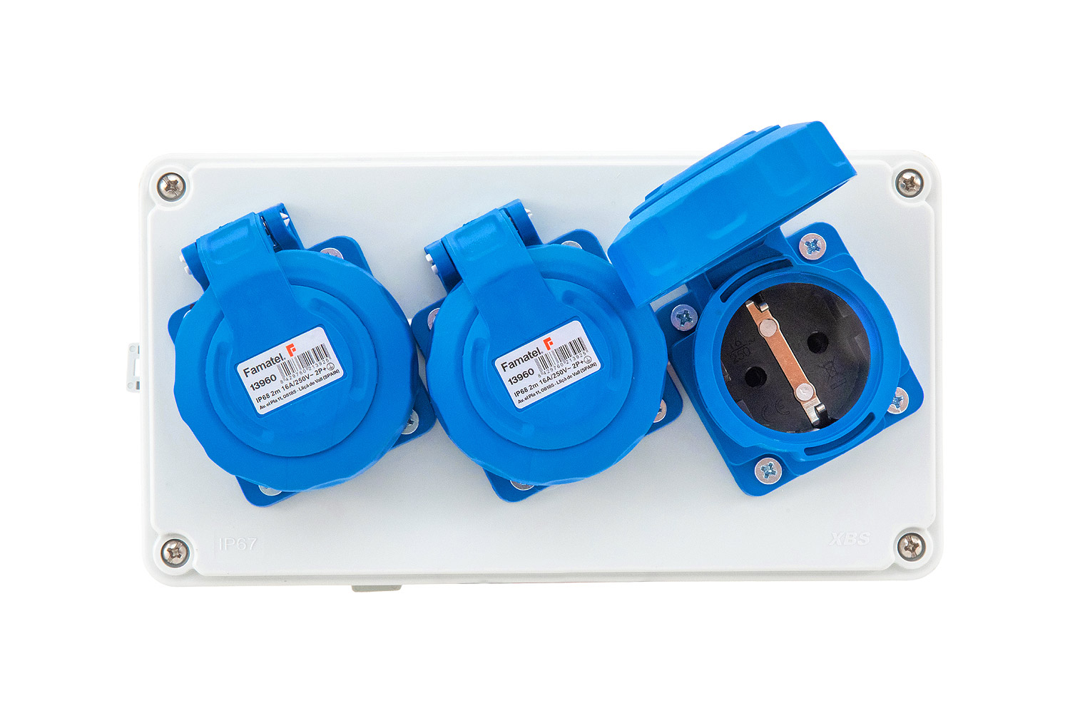 Configurație: tablou prevăzut cu 3 prize Schuko 230V (albastre IP68), standardizate pentru conectarea echipamentelor electrice uzuale.