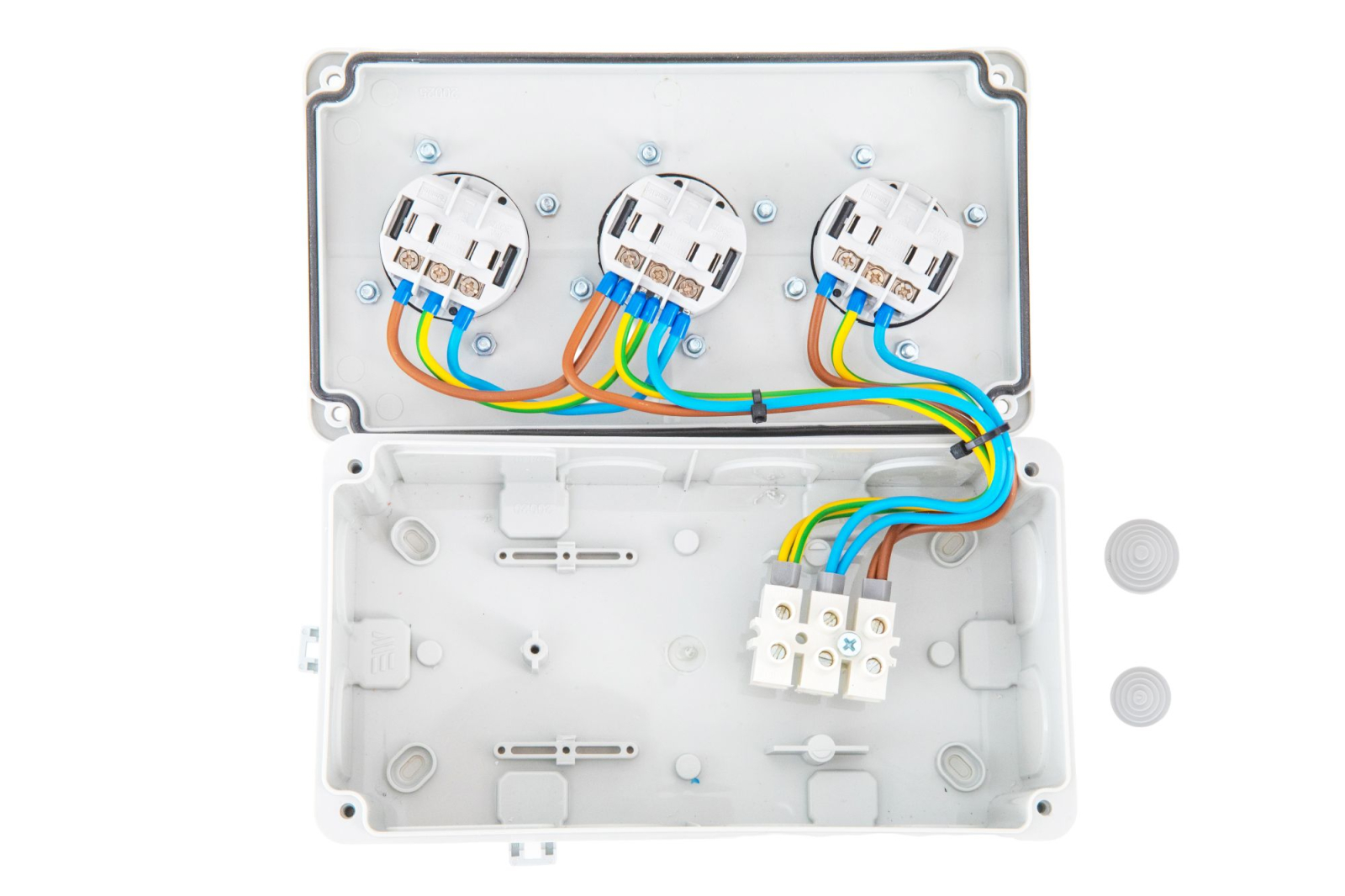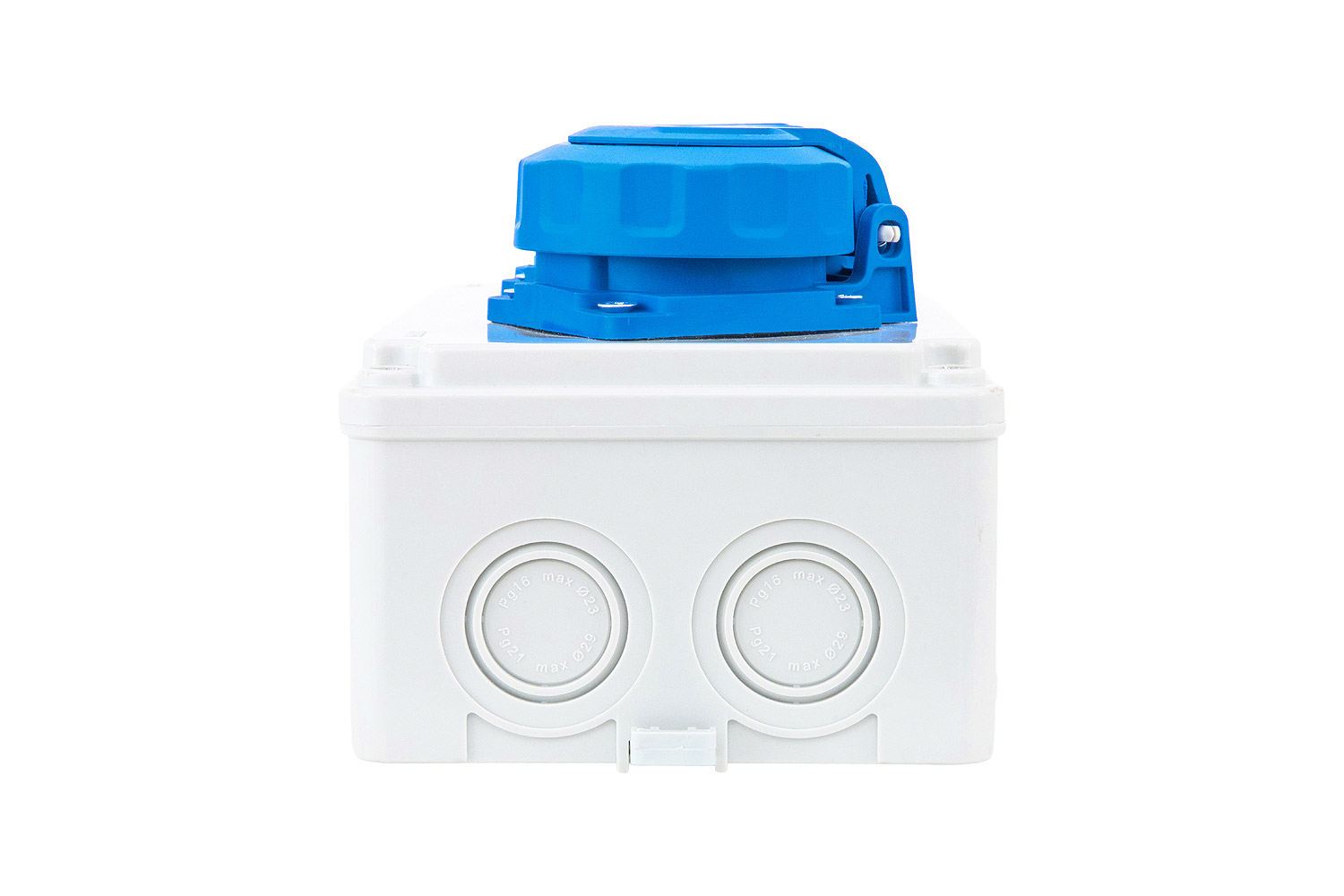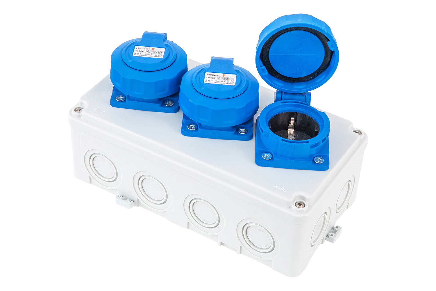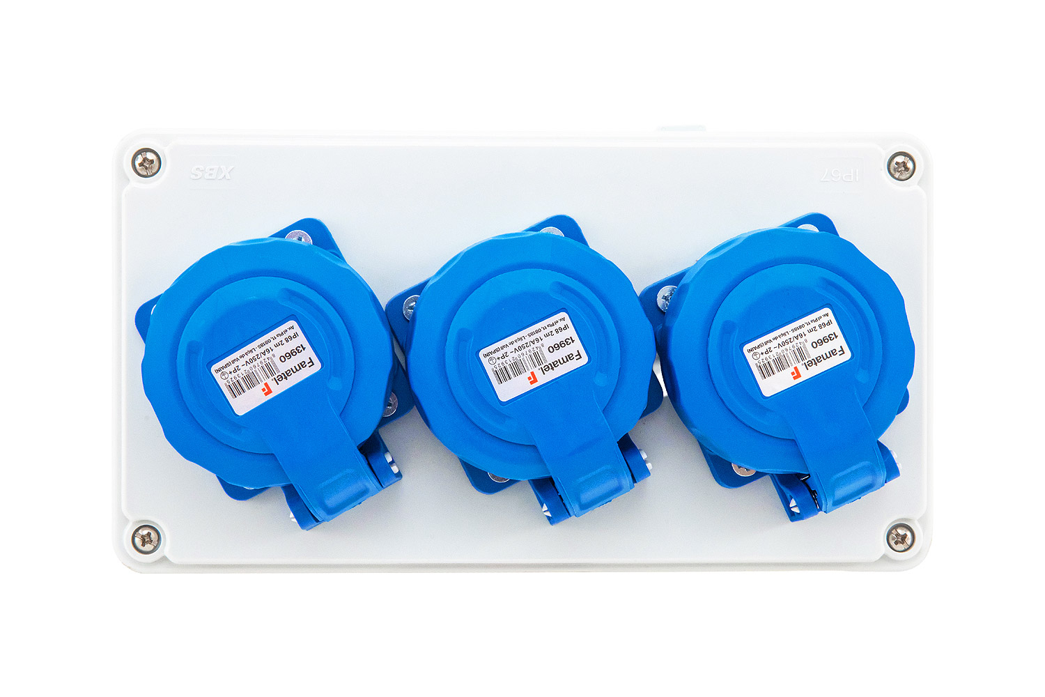 Configurație: tablou prevăzut cu 3 prize Schuko 230V (albastre IP68), standardizate pentru conectarea echipamentelor electrice uzuale.