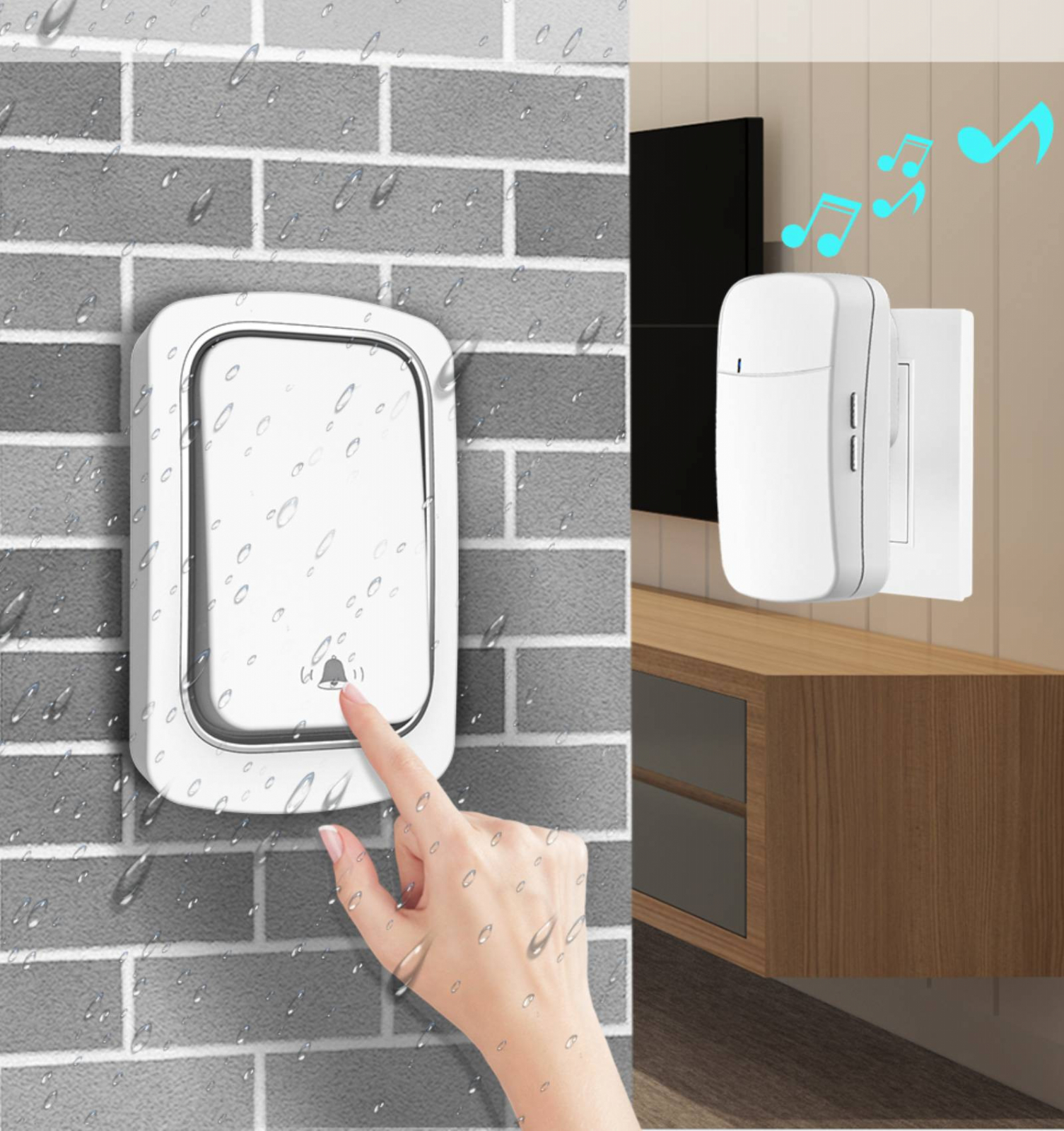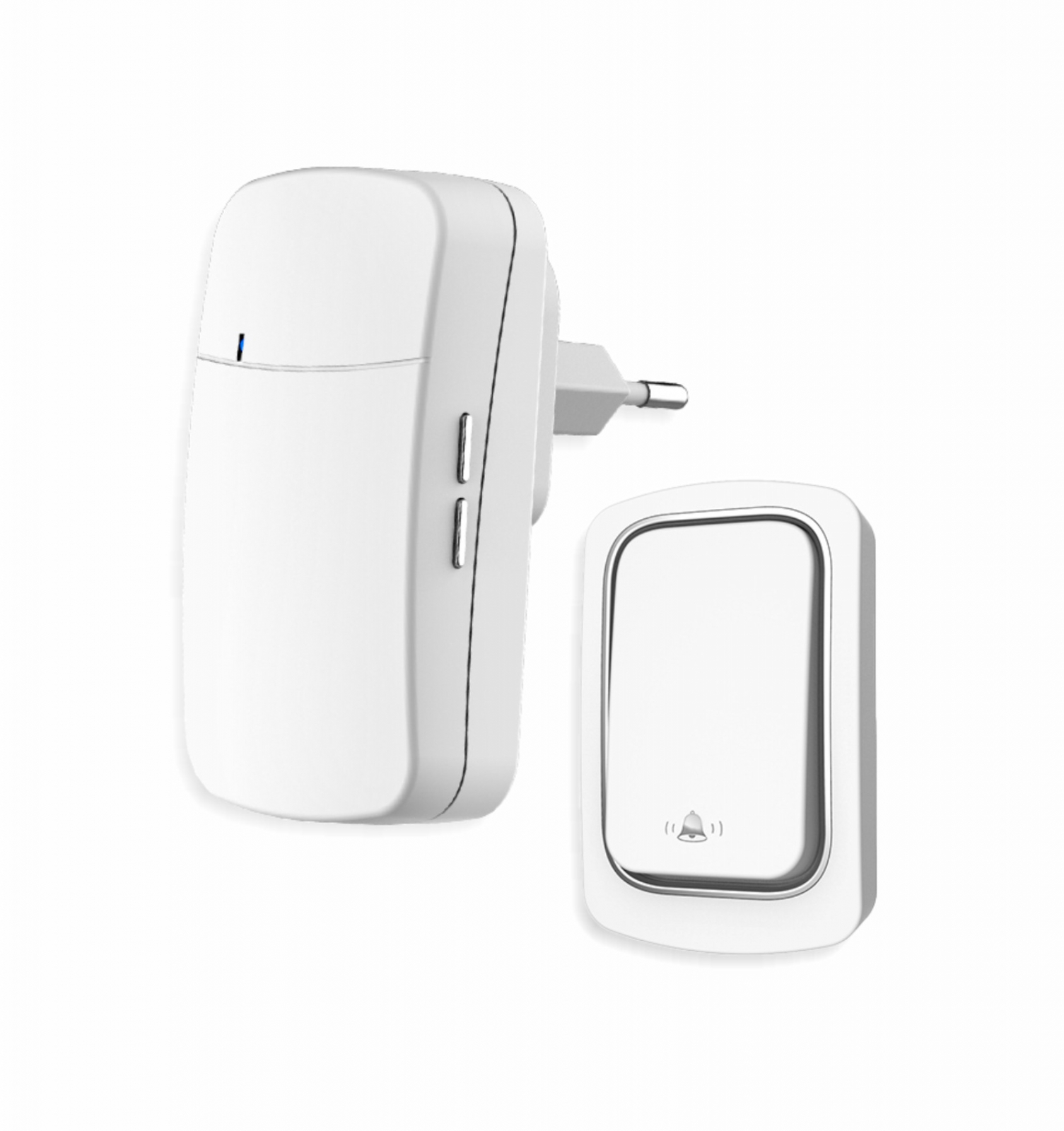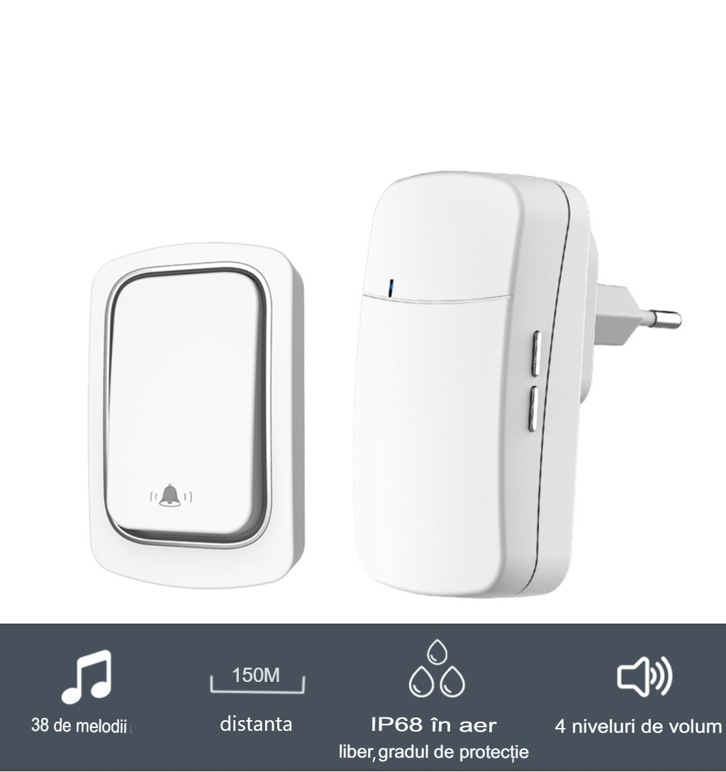 Sonerie fără fir și fără baterie 1 transmițător - comutator cinetic (1buton) și 1 receptor alb ( 1 sonerie) la priză , 38 melodii, distantă 150m. IP68 (buton)