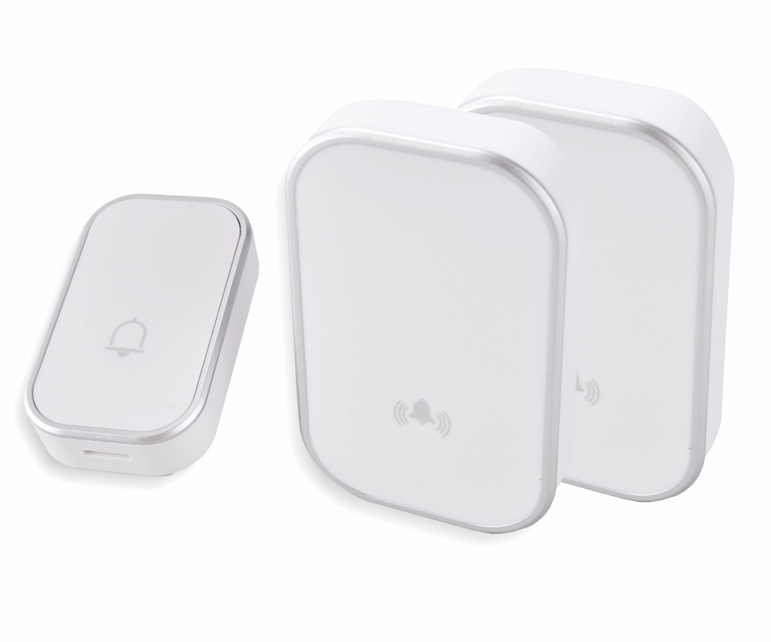 Sonerie fără fir 1 transmițător - comutator cu baterie 12V (1 buton) și 2 receptoare albe ( 2 sonerii) la priză , IP44
